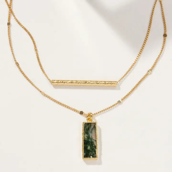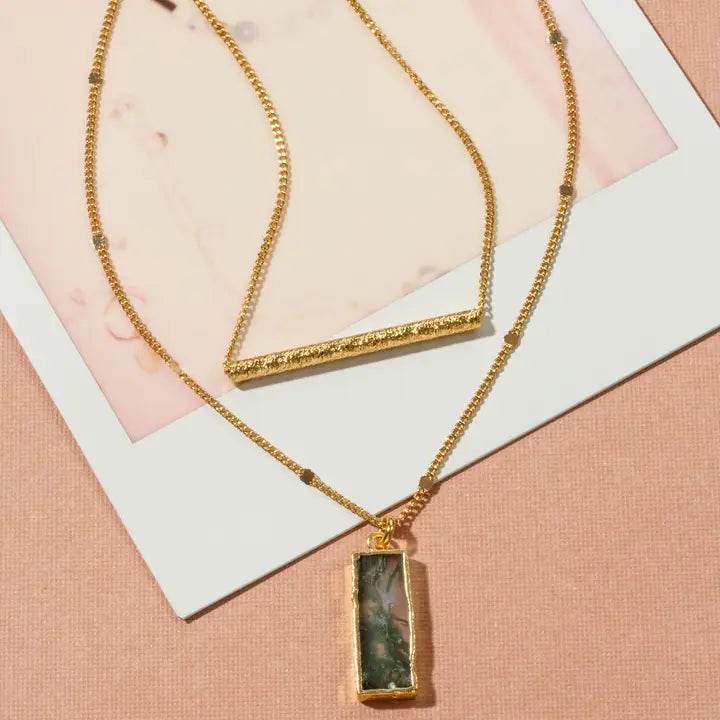 The bar necklace is a great basic chain that features hand-textured shimmering metal, while the sparkly chain features a funky Moss Agate charm. -14k Gold Plated Brass -16" and17" with 2" extender -Genuine Moss Agate
